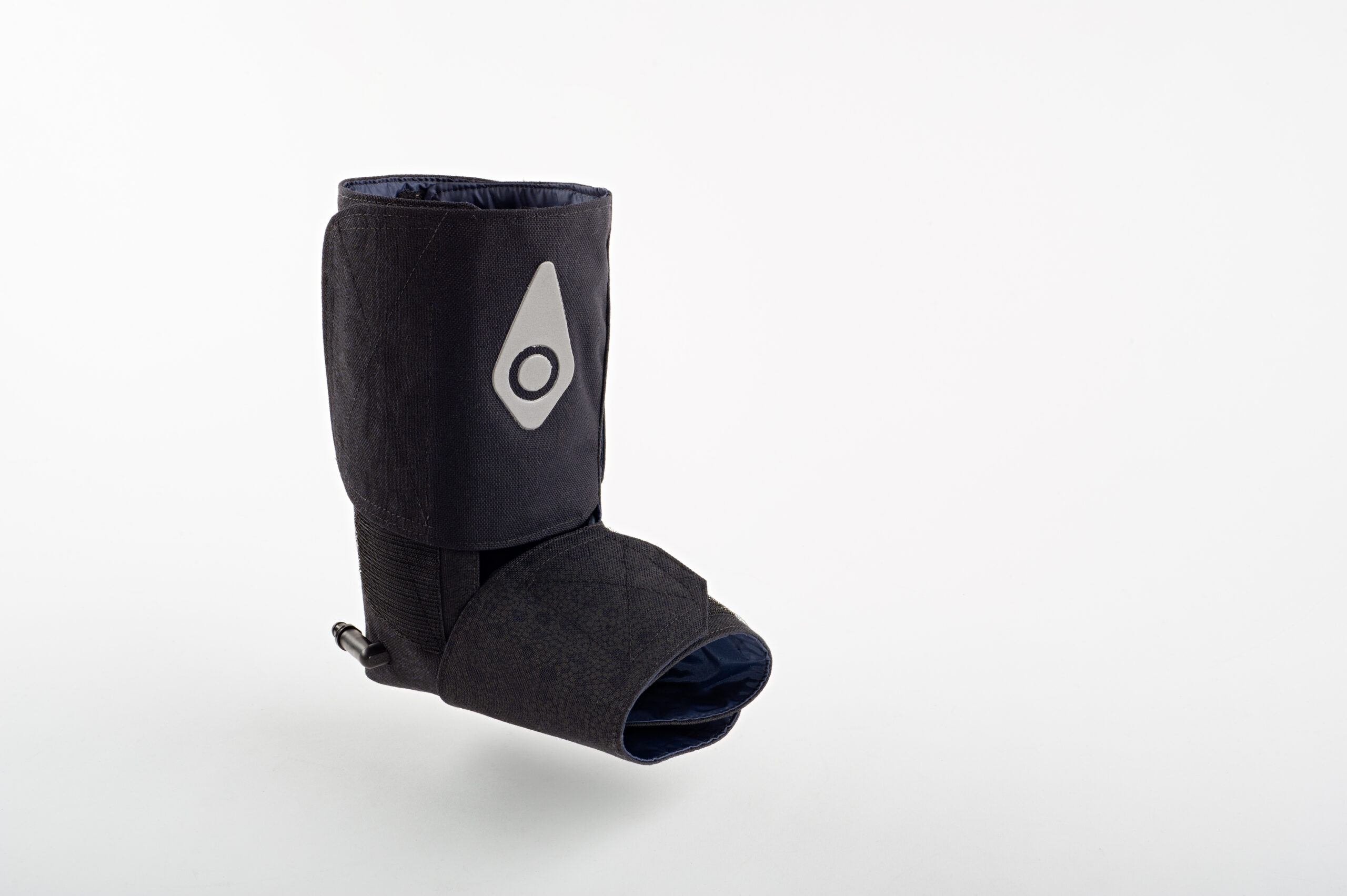 The Squid Go Ankle System includes a specially contoured ankle wrap, a reusable cold gel pack, and a portable pump with connector tube and charger.